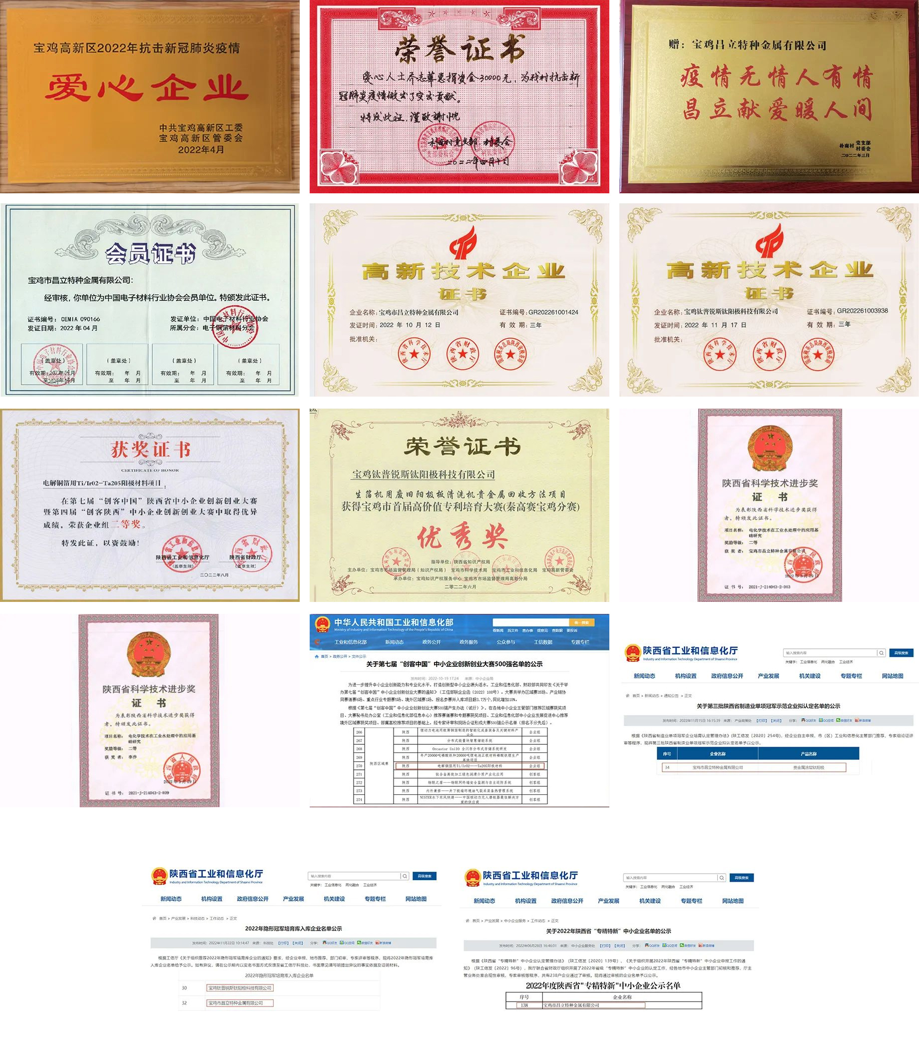歲月不居,天道酬勤。回顧2022年,公司創(chuàng)造了可喜可賀的成績(jī)。在疫情期間承擔(dān)社會(huì)責(zé)任,助力一線抗疫。昌立公司被認(rèn)定為陜西省“專精特新”中小企業(yè);《電化學(xué)技術(shù)在工業(yè)水處理中的應(yīng)用基礎(chǔ)研究》項(xiàng)目獲“省科學(xué)技術(shù)進(jìn)步獎(jiǎng)”二等獎(jiǎng);入選第三批陜西省制造業(yè)單項(xiàng)冠軍示范企業(yè);入選2022年陜西隱形冠軍培育庫(kù)。鈦普銳斯被認(rèn)定為“國(guó)家高新技術(shù)企業(yè)”;2022年陜西省秦創(chuàng)原高價(jià)值專利大賽分賽區(qū)-“寶雞高價(jià)值專利培育大賽優(yōu)秀獎(jiǎng)”;第四屆“創(chuàng)客陜西”中小企業(yè)創(chuàng)新創(chuàng)業(yè)大賽省級(jí)決賽獲大賽企業(yè)組二等獎(jiǎng);入圍第七屆“創(chuàng)客中國(guó)”中小企業(yè)創(chuàng)新創(chuàng)業(yè)大賽500強(qiáng);入選2022年陜西隱形冠軍培育庫(kù)。